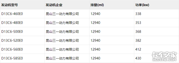 动力链应该是大家最关心的了,根据公示信息,新款车型搭载的是三一自主的三一道依茨D12和D13两种发动机,其中D13系列发动机最大可以输出585马力,并且满足国六排放标准,而D12最大输出是517马力,是国五标准。