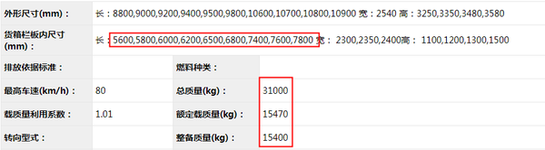 此外车辆可选货厢尺寸也是极为丰富,例如有5.6米、5.8米、6.2米、6.8米、7.8米等,基本覆盖了常见工况所需的全部货厢尺寸,同时货箱样式也有多种可选。整车底盘自重10.2吨,整车带货厢自重为15.4吨。