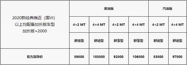 2.8T柴油发动机来自五十铃,其最大功率120马力,最大扭矩285牛米。2.4T柴油发动机来自三菱,最大功率211马力,最大扭矩320牛米。两款发动机均匹配了5速手动变速箱,同时,新车还可选装四驱系统。