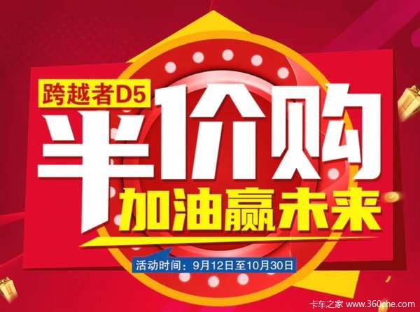 在9月12日至10月30日期间购买跨越者D5系列车型的新用户可参与半价购车权抽奖,老用户可参与油卡抽奖活动(活动入口):