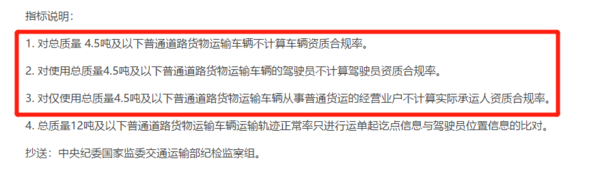 2. 对使用总质量4.5吨及以下普通道路货物运输车辆的驾驶员不计算驾驶员资质合规率。