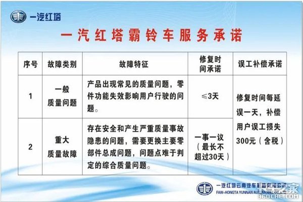 针对保修期内的所有霸铃车型,产品出现常见的质量问题,零件功能失效影响用户使用的问题,保证72小时内解决问题,针对存在安全和产生严重质量事故隐患的问题,需要更换主要零部件总成,问题点难于判定的综合质量问题保证30天内解决问题(一事一议)的一汽红塔汽车做出误工补偿承诺:修复时间每延误一天,补偿用户误工损失300元支付车主停运赔偿。