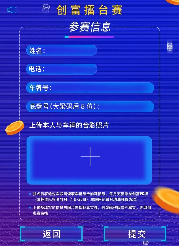 本次乘龙创富擂台的活动时间为2020年10月11日-2021年3月31日,创富擂台赛的活动对象仅面向驾驶乘龙H7 3.0 500马力及以上车型的用户。油耗竞猜则不限制车型,面向所有卡友。卡友可根据自身情况选择相对应的环节进行挑战,点击开始挑战后,需按照提示,填写参赛信息并点击提交。提交成功后,即为成功参与挑战。