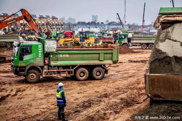 火神山医院施工方累计平整全部场地5万平方米,相当于7个足球场大小,开挖土方15万立方米,足以填满57个标准游泳池。面对如此庞大的土方清运任务,上汽红岩杰狮渣土车与装载机、挖掘机完美配合,终于在期限要求内出色完成了场地平整、砂石回填任务,成为了建设现场出勤率最高的产品。