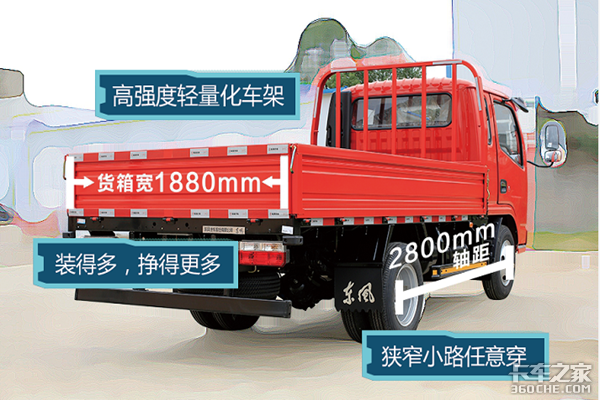 答:2800mm的轴距,刚好可通过乡间公路上常设的“水泥墩子”,这是东风福瑞卡F5能自由穿梭于路况复杂、狭窄的乡间小路的秘诀,整车性能可适应国家各种道路运输要求。1880mm的货箱宽度,满足了大货量的载物需求,货箱更高,装得更多,挣得更多!