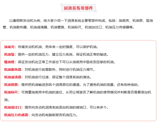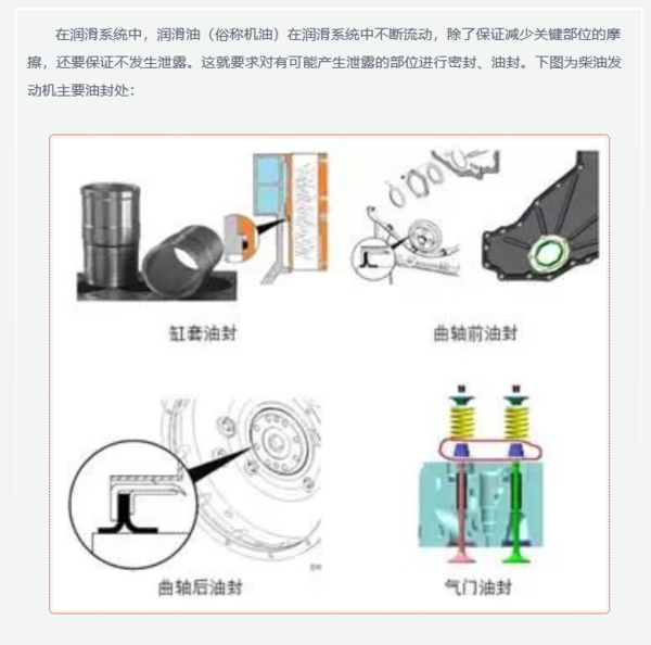 以上的各个润滑系统零部件及相关的油封,均按照各自设定好的功能和作用来工作,从而组成一个完整的润滑系统,来保证整个柴油机的正常运行。