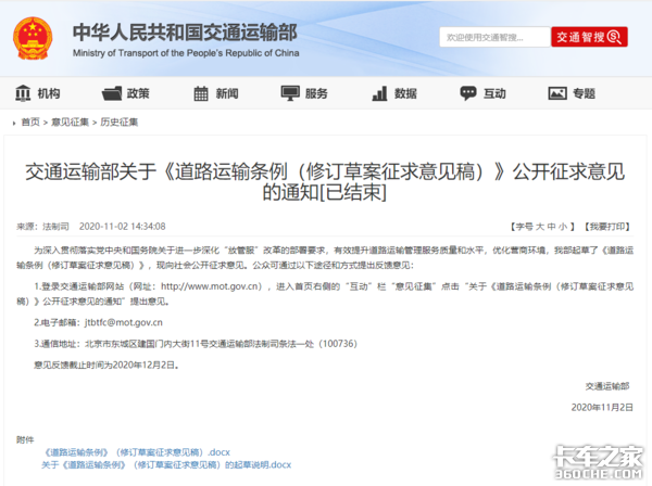 11月2日,交通运输部官网公布了《道路运输条例(修订草案征求意见稿)》(以下简称《征求意见稿》),表明该条例即将进行修订!那么对于货运行业来说,此次修订有哪些关键点呢?