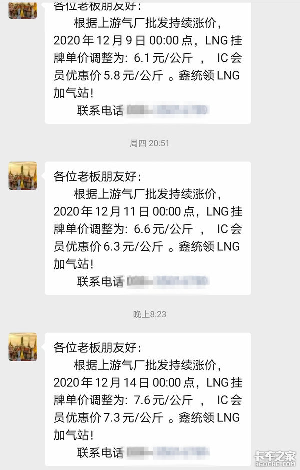 有卡友分享了群里的聊天信息,从12月9日到12月14日,短短5天的时间,LNG就上浮了3次价格,从不到6元的价格,到挂牌单价7.6元/公斤,着实让人措手不及。截止到12月18日,成都德阳地区的LNG价格已经突破8.6元每公斤。