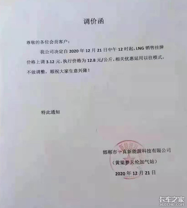 某加气站在12月21日发布了调价函,从图上可以看到,LNG销售挂牌价格上调3.12元,执行价格为12.8元/公斤。和卡友聊天中得知,此前算上过路费,基本上每公里投4元,而现在同样的路段,LNG涨价后每公里涨到到8元多了,成本翻了一番,但运费却没有涨多少,所以就干脆停运了,提前过年!