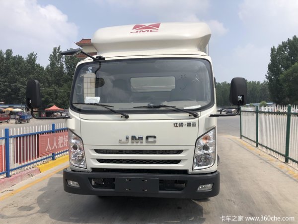 江铃凯运采用白色涂装,驾驶室顶部的大尺寸扰流罩带有红色江铃车标及字母标识,风挡玻璃两侧的反光镜采用宽体设计,拓宽驾驶员安全视线。