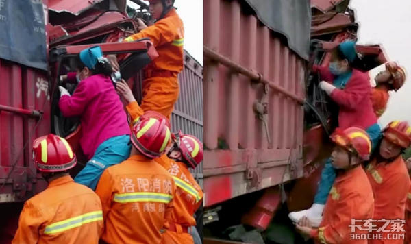 2020年10月,河南洛阳二广高速两辆运煤车发生追尾事故,两车无法分离,后车车头严重变形,车内人员受伤严重。在现场救援条件有限的情况下,消防战士在车窗边搭起人梯托起护士,共同为卡友完成了包扎急救,使得卡友脱离险情,被成功救出。