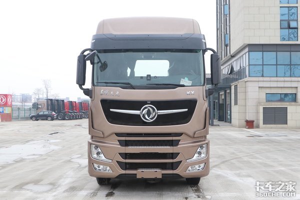 东风天龙旗舰产品采用经典的家族式前脸,提供金黄、流沙棕、中国红等不同颜色的喷漆可选,两侧标志性的黑色拉花从大灯部分一直延伸到车身侧面,非常醒目别致。