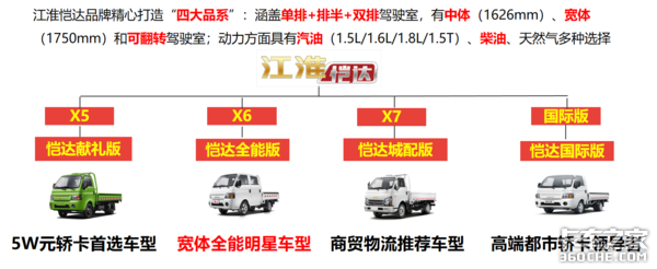 目前,江淮恺达旗下四大产品系列定位不同细分市场,每个系列都具备有明确的差异化优势,可满足不同卡友选车时的差异化需求。