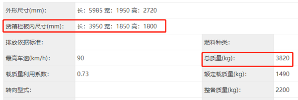 厢式车将会装配一个尺寸为3950x1850x1800mm的货厢,整备质量为2200kg,可以看到即便是厢式上装也只重了200kg,上的是总质量为3820kg的公告。