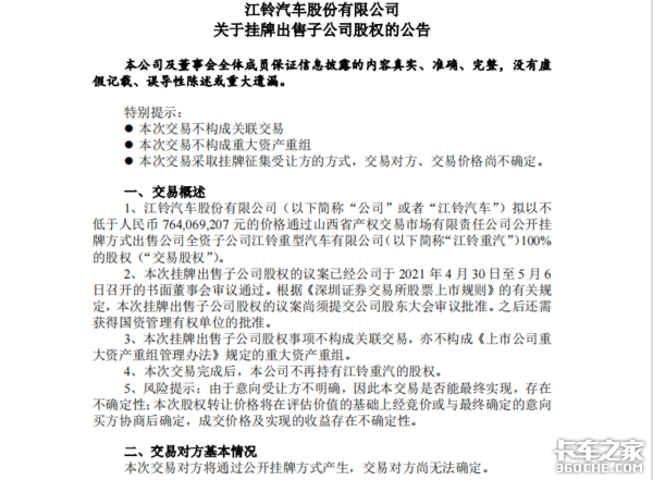【卡车之家 原创】5月7日晚间,江铃汽车发布了一条公告,江铃汽车股份有限公司拟以不低于7.64亿元的价格,公开挂牌出售公司全资子公司江铃重型汽车有限公司100%的股权。