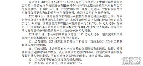 江铃汽车于 2012 年以不超过 2.7 亿元人民币的价格受让了中国兵器装备集团公司及中国长安汽车集团股份有限公司合计持有的太原长安重型汽车有限公司的全部股权;于 2013 年 1 月,在完成相应的工商登记变更后,太原长安重型汽车有限公司更名为江铃重型汽车有限公司,成为本公司的全资子公司。