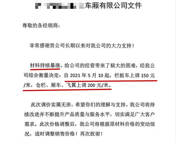 近日,车厢厂对外发布消息称,由于材料持续暴涨,自5月10日起,栏板车上调150元/米,仓栏、厢车、飞翼上调200元/米。