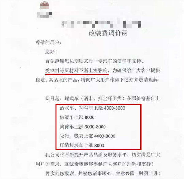 随后,一厂家也发布改装费调价函称,在原价格基础上,洒水车、抑尘车上涨4000-8000元,供液车上涨8000元,钩臂车上涨3000-8000元,吸污、吸粪上涨4000-8000元,压缩垃圾车上涨8000元。