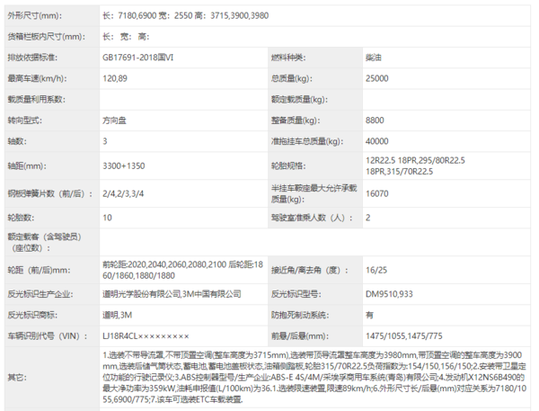 从公告来看,产品型号为HFC4254P1K7E33S,搭载的是北京福田康明斯发动机,满足国六排放标准。
