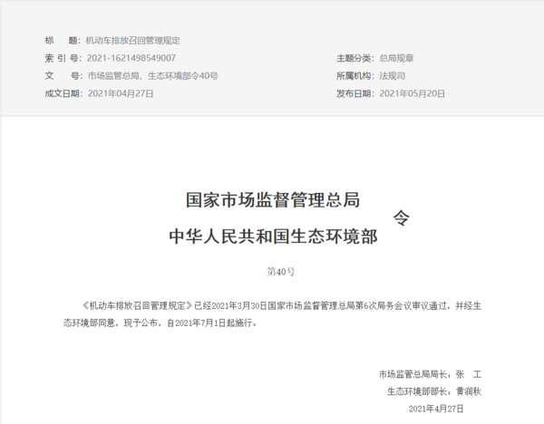 根据要求,《机动车排放召回管理规定》自2021年7月1日起正式实施。其中,国家市场监督管理总局会同生态环境部负责机动车排放召回监督管理工作。