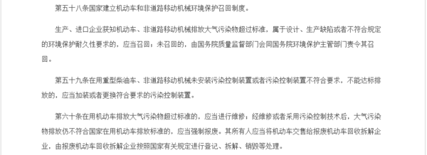 在2015年8月审议通过的《大气污染防治法》第五十八条规定:“国家建立机动车和非道路移动机械环境保护召回制度。生产、进口企业获知机动车、非道路移动机械排放大气污染物超过标准,属于设计、生产缺陷或者不符合规定的环境保护耐久性要求的,应当召回;未召回的,由国务院市场监督管理部门会同国务院生态环境主管部门责令其召回。”