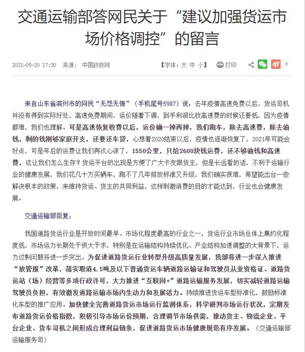 近日,来自山东省滨州市的网民在交通运输部官网留言说:去年疫情高速免费以后,货运司机并没有得到实际好处,高速免费期间,运价随着下调,到手利润比收高速费的时候还要低,因为疫情都难,我们也理解。