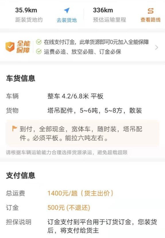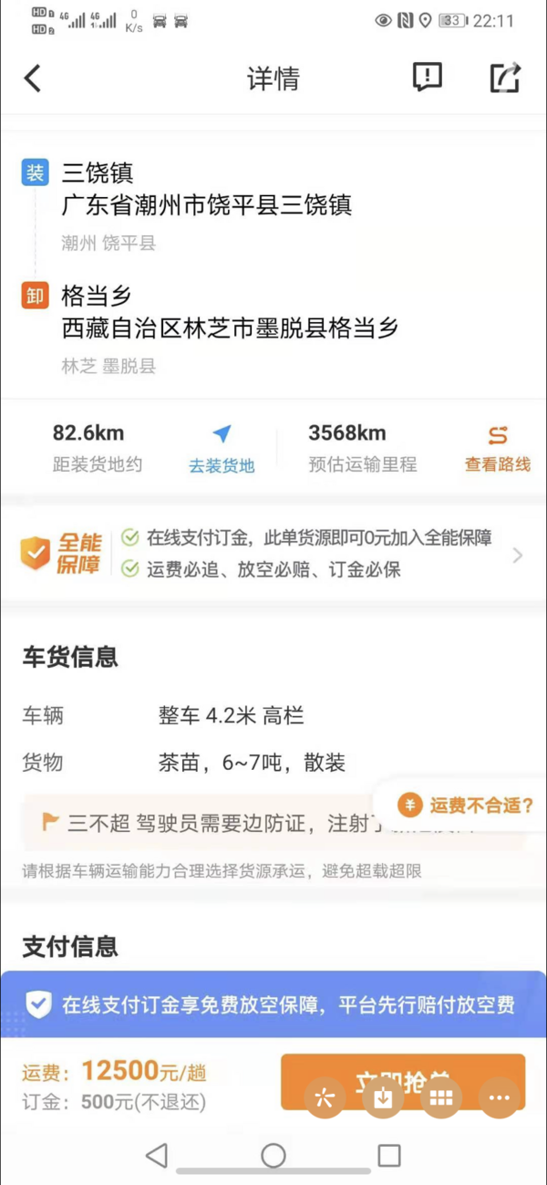 魏师傅也向小编分享了从广东到西藏林芝地区的运单详情,平台运单详情显示:货物为6-7吨茶苗,预估运输里程为3568公里,车辆需求是4.2米高栏,运费12500元一趟,但还需收取500元订金。