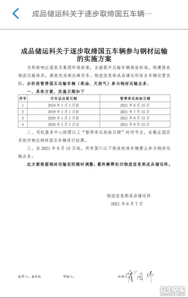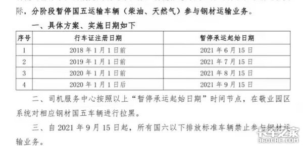 该企业文件表示:自2021年9月15日起,所有国六排放标准以下车型禁止参与钢材运输业务。同时该企业文件中也指明了所有国六排放标准以下车型包括柴油和天然气车型。