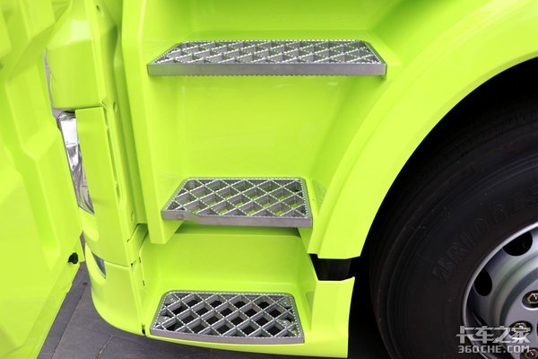 前保险杠位置设置有方便蹬车擦拭前挡风玻璃的两级蹬车踏板,且踏板宽度非常宽,前挡风玻璃下面左右两侧各布置了把手方便攀爬,实测站在上层踏板上可以够到前挡风玻璃的绝大部分区域。
