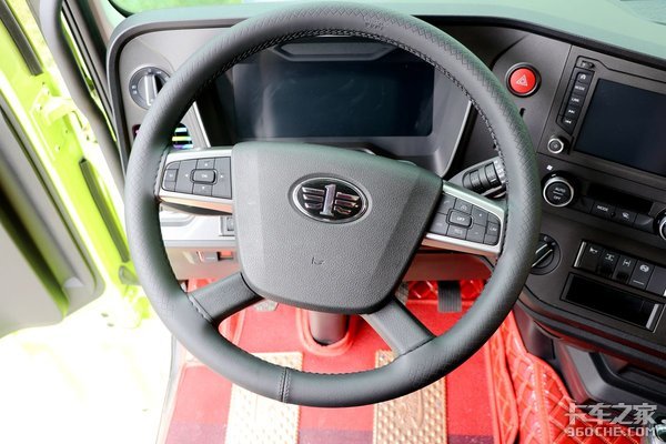 解放J7 8×4载货车的仪表采用了全液晶仪表,可显示丰富的行车信息,且配备有8寸北斗兼容触摸式车载终端。方向盘采用了皮质四幅多功能方向盘,保证的握感的同时,也提供了非常便捷的操纵性。