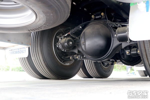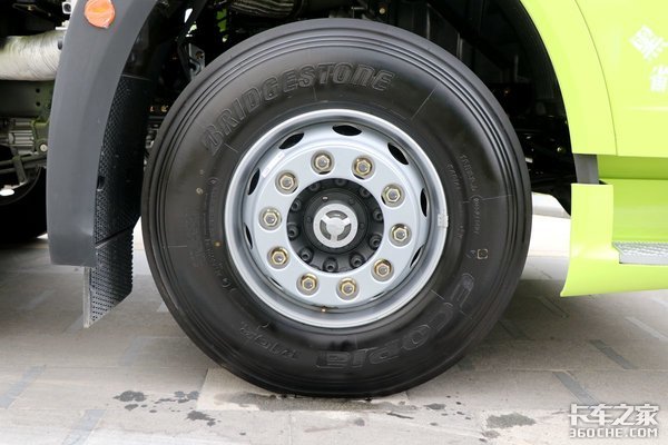 轮胎采用了普利司通品牌的规格为12R22.5型18层级无内胎轮胎,钢制轮圈。