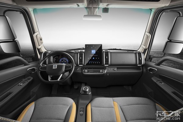 由于是新能源车型,所以在一些电气化架构上就有一些天生的优势,这款车标配了旋钮挡把,电子手刹等配置。这些配置此前货车上都比较少,得益于吉利正向开发GLA(Geely Light Truck Architecture)架构,把一些轿车的配置直接融于到这款卡车当中。