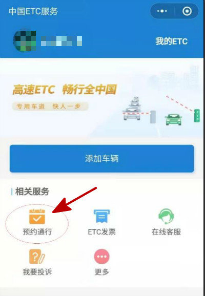 1、在微信中搜索“中国ETC服务”小程序,进入该程序后点击相关服务栏下“预约通行”;
