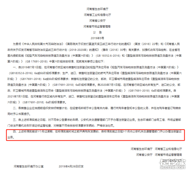 其实早在国六排放标准实施之前,考虑到经销商库存里的国五车型,不少地区都下发了延长国五上牌时限的公告。如小编所在的河南地区,根据河南省生态环境厅公告的内容显示:自2021年7月1日起,在河南省行政区域内所有生产、进口、销售和注册登记的重型柴油车(3.5吨及以上)应符合《重型柴油车污染物排放限值及测量方法(中国第六阶段)》(GB17691-2018)6a阶段标准要求。上述标准实施设1个月过渡期,在标准实施时间之前开具购车发票的,自标准实施之日起1个月内公安机关交通管理部门予以办理注册登记业务。