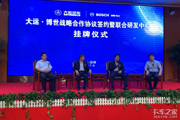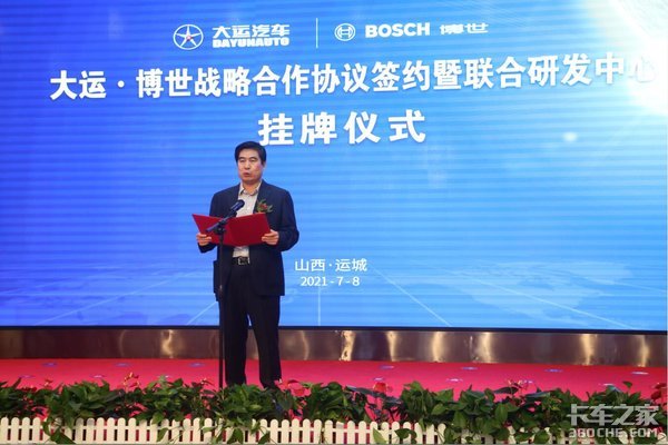 仪式现场,大运汽车股份有限公司董事长远勤山致辞表示,大运汽车一直坚持选择国际顶级厂商作为合作伙伴,此次与博世共建联合研发中心,标志着双方正式建立起高度互信的战略联盟关系。”