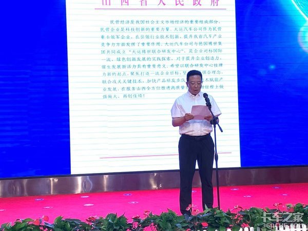 此次合作协议签约,暨联合研发中心挂牌仪式同样深受山西省市各级政府领导的高度重视和大力支持。山西省科技厅副厅长牛青山现场宣读了蓝佛安省长发来的贺信。蓝省长在贺信中指出:“大运汽车公司与德国博世集团共同成立“大运博世联合研发中心”,是企业对标国际一流、绿色创新发展的实践探索,对于提升企业创造力、催生发展新活力具有重要意义。”