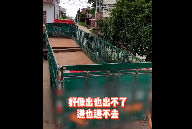 7月8日,一个大货车误进湖南郴州桂阳县的一个村子里,由于村路较窄,司机对道路也不熟,导致进退两难将村民的房子蹭到。