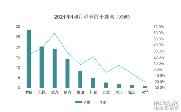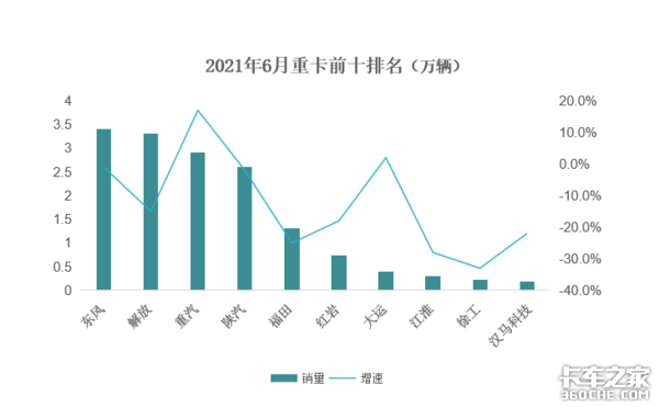 【卡车之家 原创】近日,中汽协公布2021年上半年卡车产销数据。6月产销分别为33.7万辆和39.4万辆,产量同比上涨25.7%,销量同比下降20.2%。以下为重卡销量前十排名情况。