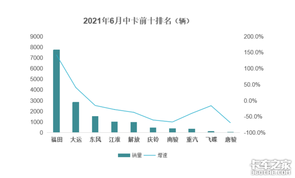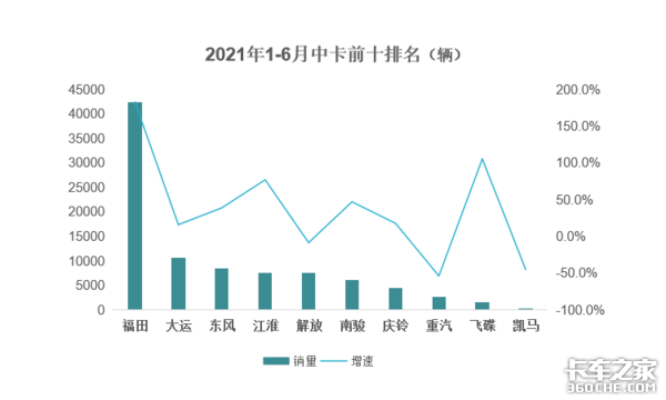【卡车之家 原创】近日,中汽协公布2021年上半年卡车产销数据。6月产销分别为33.7万辆和39.4万辆,产量同比上涨25.7%,销量同比下降20.2%。以下为中卡销量前十排名情况。