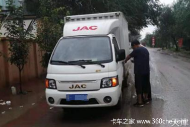 江淮轻卡维修人员身披塑料袋冒雨抢修车辆