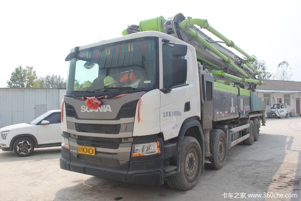 这是一辆8X4的P450,2020年8月从中联重科制造下线,到泵站老板手上刚刚半年,可以看到老板对于车辆十分爱护,外观清洁,内饰有彩带装饰。