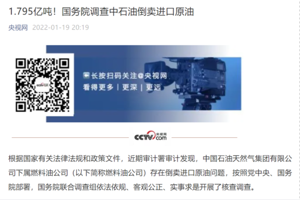 根据央视网的通报来看:按照党中央、国务院决定,有关部门对中石油倒卖进口原油问题依规依纪依法进行了严肃处理,对中石油倒卖进口原油违法违规获利予以追缴。