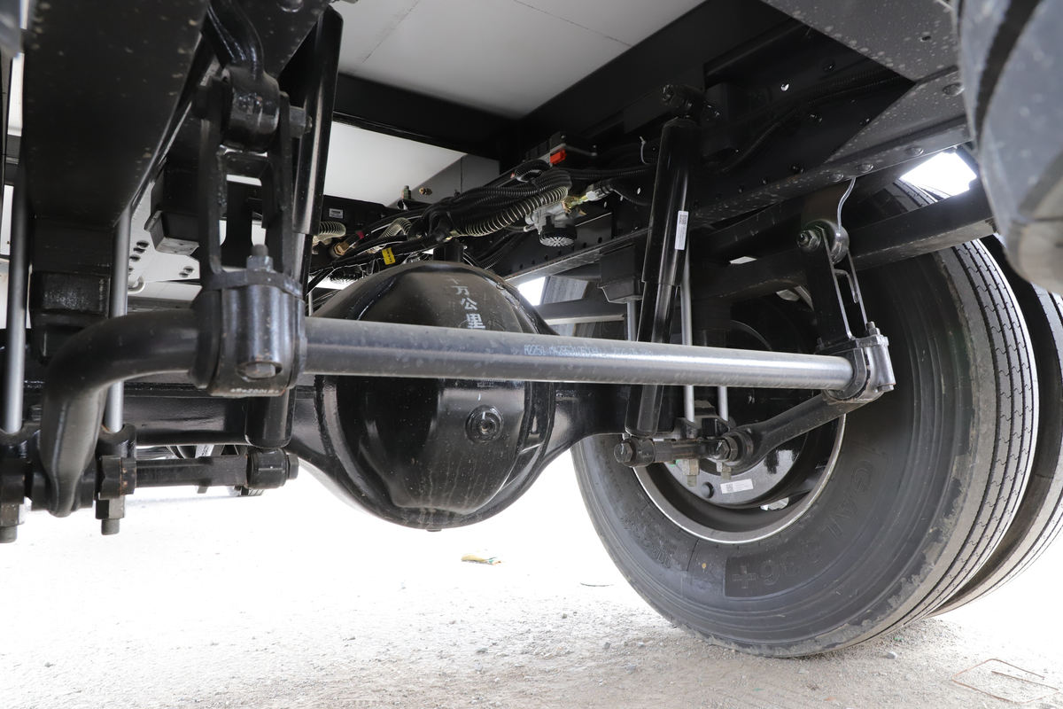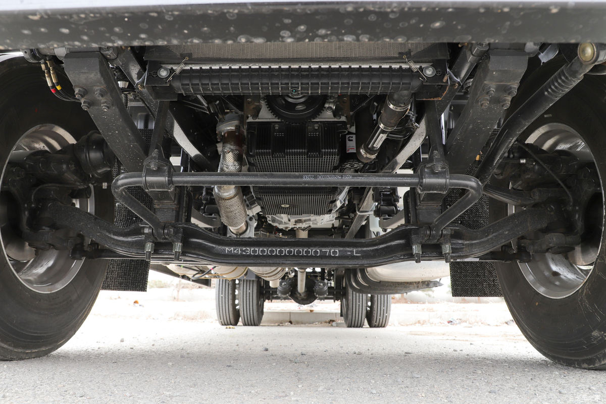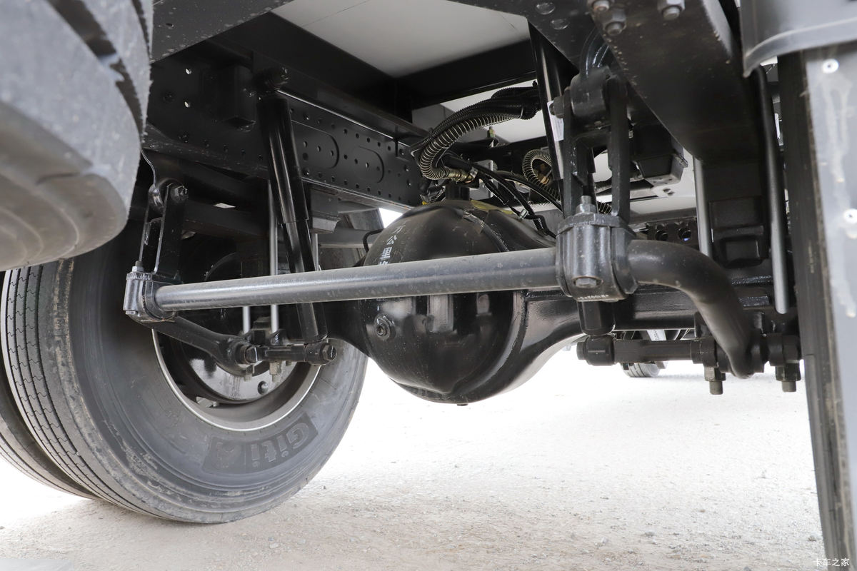 底盘搭载的是一条8吨级的后桥,速比为4.33,最大允许载荷达到了11500KG,车辆前桥、后桥均配备了横向稳定杆,在高速行驶的状态下可以让车辆操控的更加稳定。板簧采用了1/1+1的少片簧设计,可以有效降低行程中车辆的颠簸。