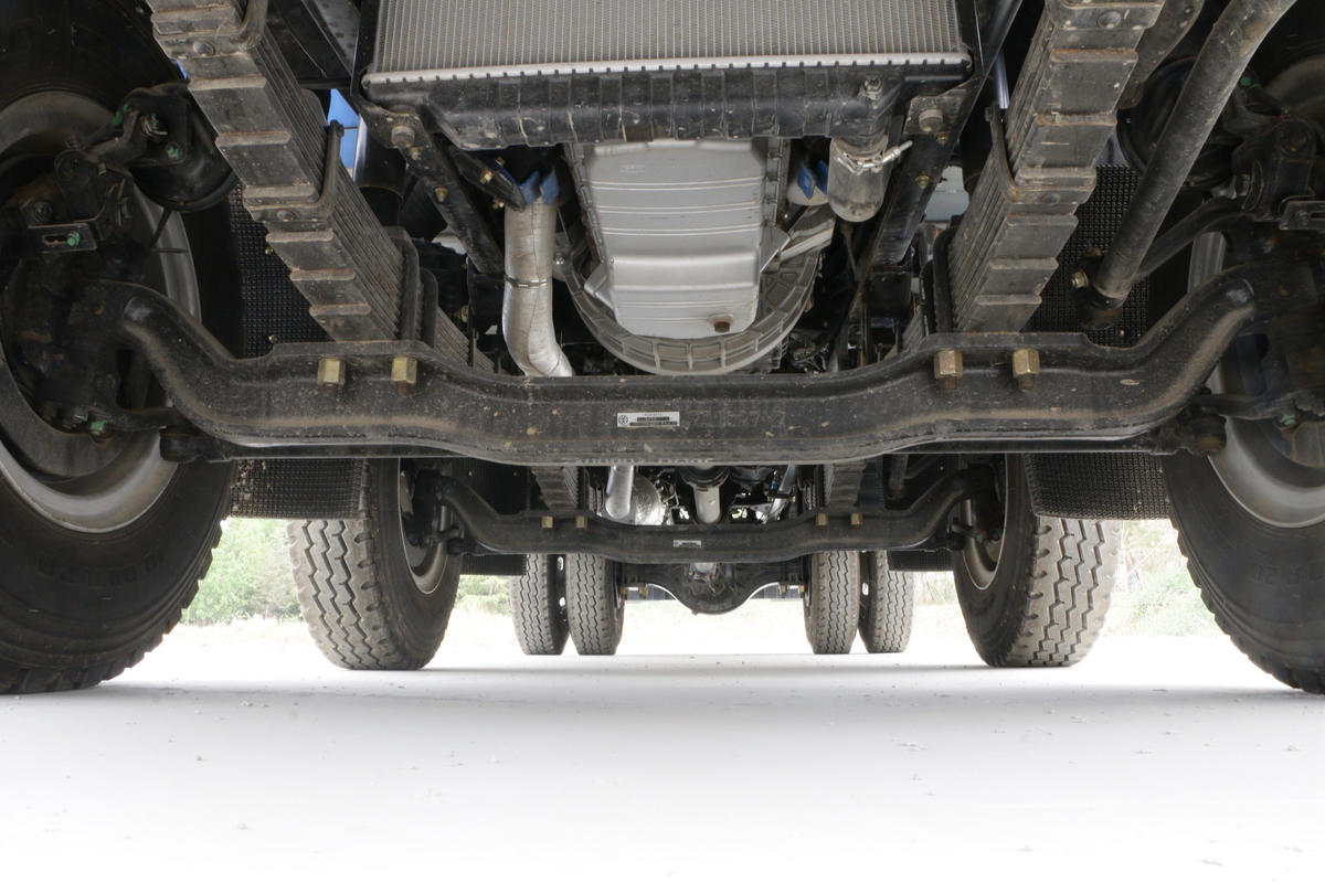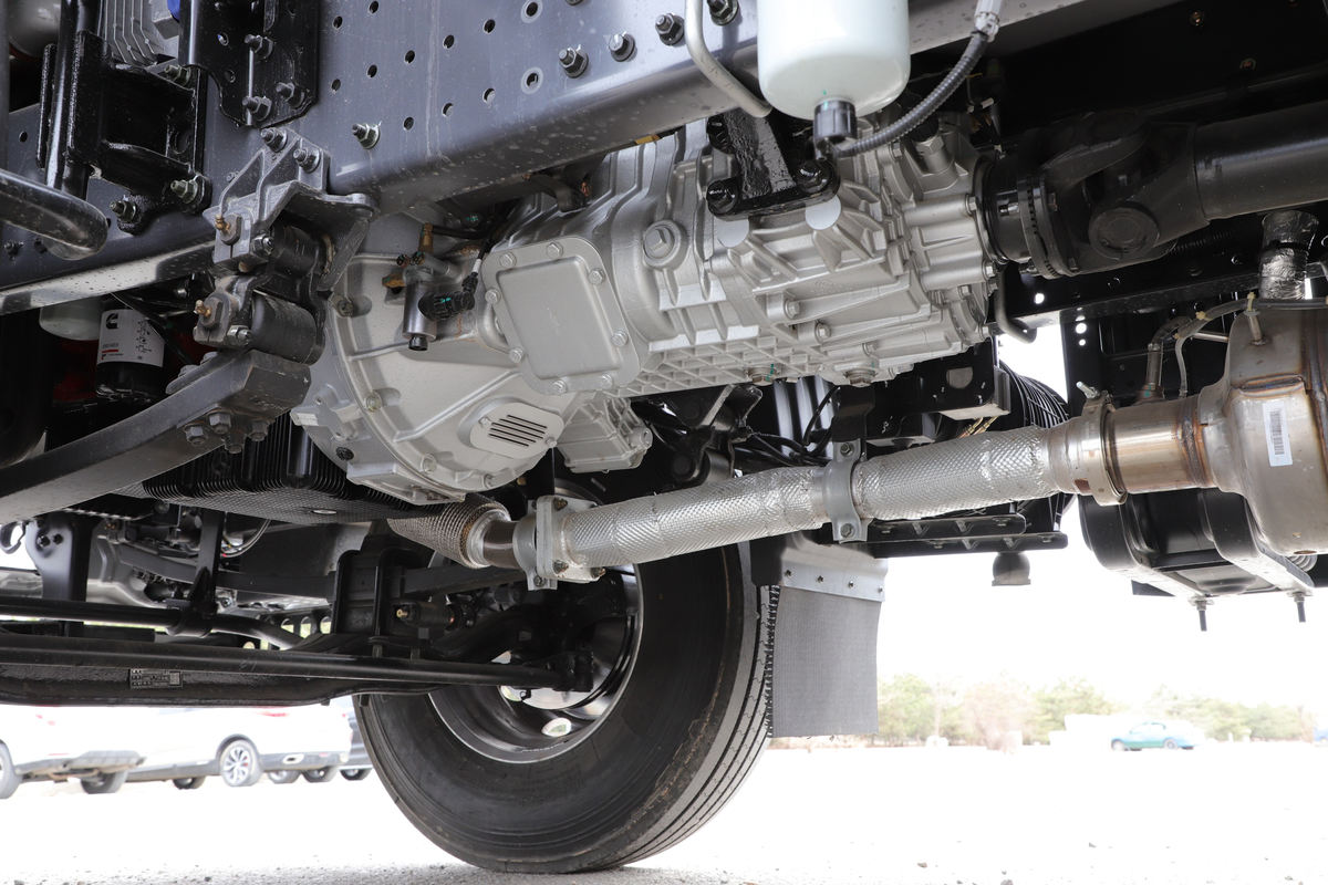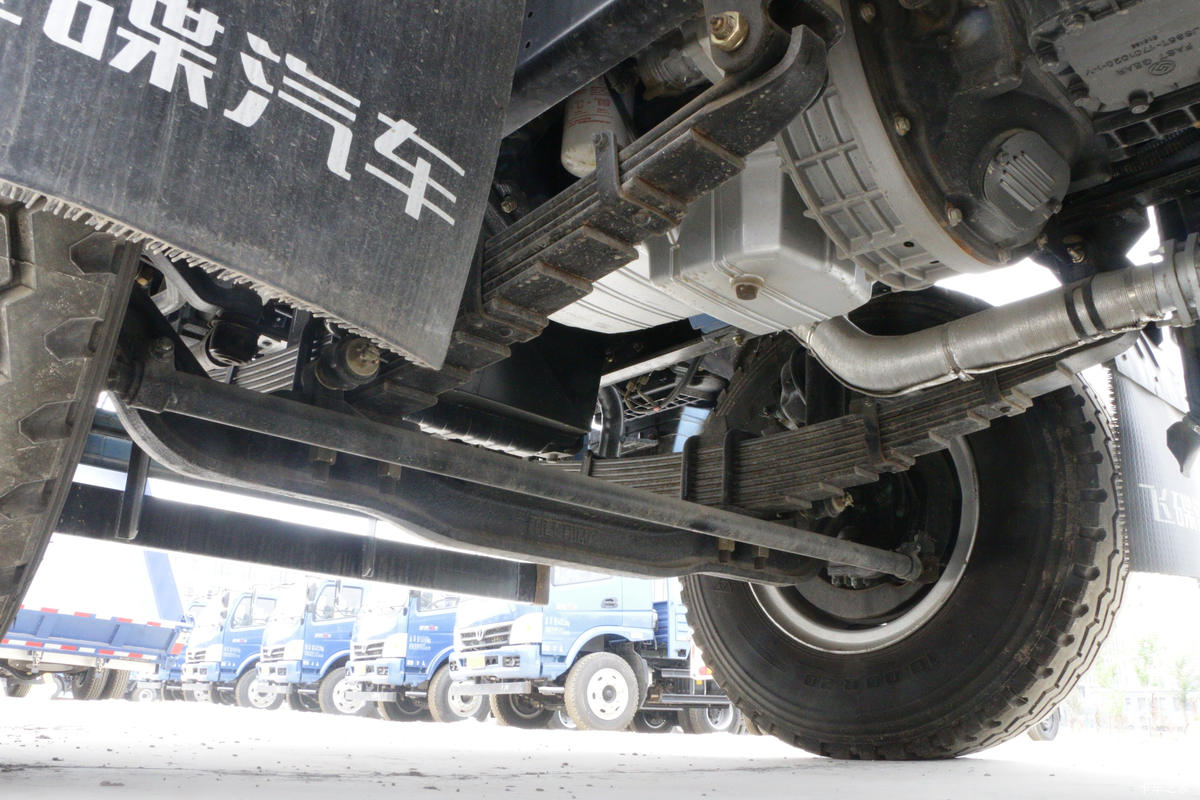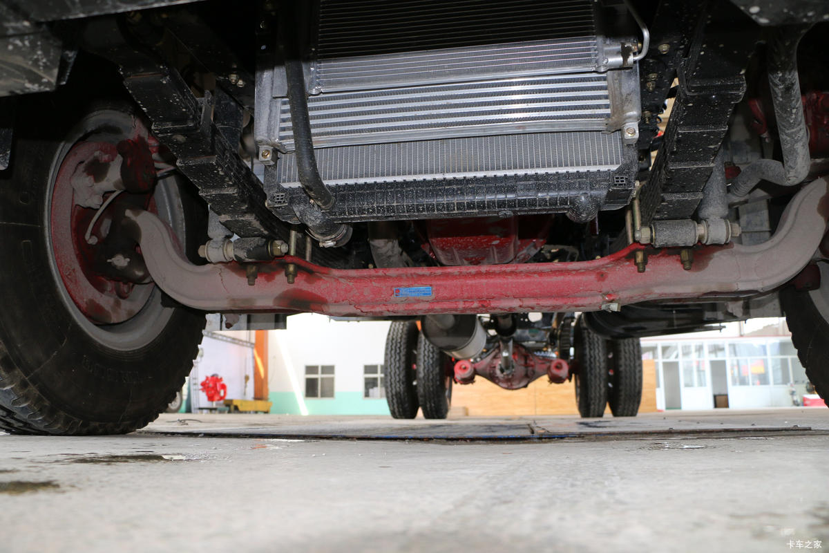 底盘搭载的是一条8吨级的后桥,速比为4.33,最大允许载荷达到了11500KG,车辆前桥、后桥均配备了横向稳定杆,在高速行驶的状态下可以让车辆操控的更加稳定。板簧采用了1/1+1的少片簧设计,可以有效降低行程中车辆的颠簸。