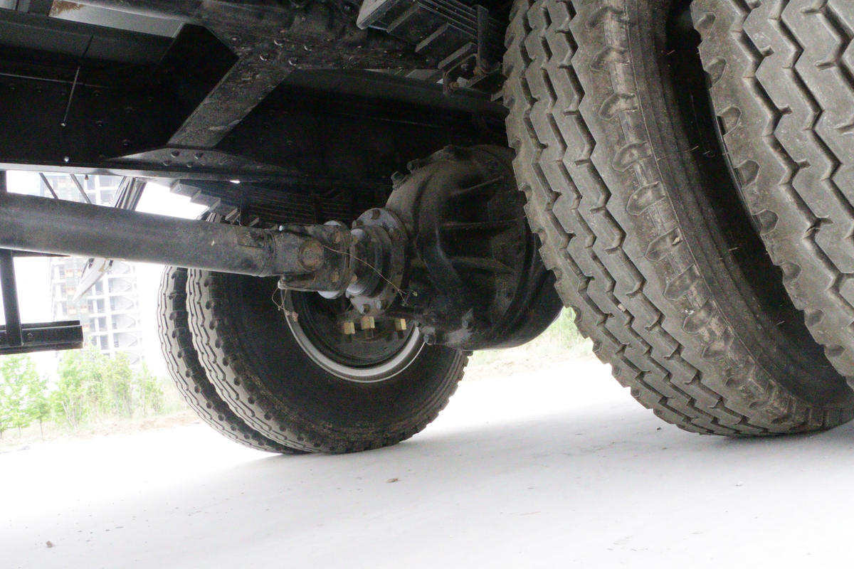 底盘方面,它搭载的是一条457后桥,后桥速比为5.833,最大允许载荷为11500KG,配合10/10/12+9的多片簧设计可以有效提升车辆的载重能力。