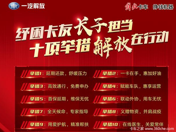 5月末,国务院常务会上的一则关于“汽车央企发放的900亿元货车贷款,要银企联动延期半年还本付息”的消息引起行业热切关注,这一政策的发布对于当前遇冷的货运行业来说可谓雪中送碳,给不少车友们解了燃眉之急。作为国资央企,一汽解放始终坚定不移的履行央企政治责任、经济责任、社会责任,第一时间下发实施细则,助力物流运输行业纾困解难。