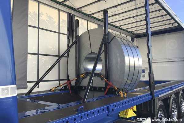 注意看,挂车内部、底部均设计有锚点,可通过钢索和尼龙绳加以固定。另外,钢卷周围还设计有方形框架,加之内凹结构和四周钢索多重固定,安全性得到了很大保障。
