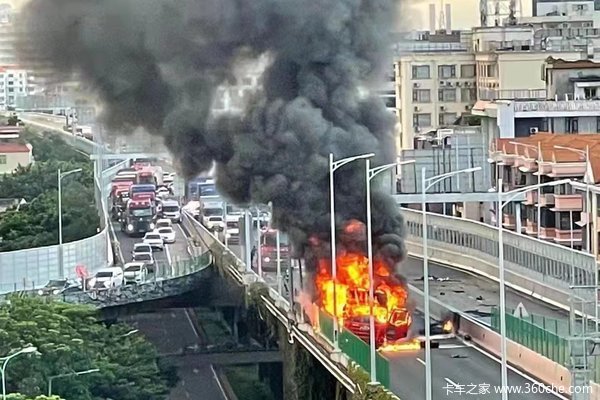 视频当中还能看到疑似货车司机已从着火车辆当中撤出,而前方并未有其他事故发生。