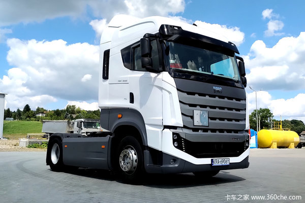 来到车身侧面,我们从驾驶室的造型中可以看到一些依维柯Stralis的影子。该车的轮眉、侧裙板都采用了哑光材质,看起来很有质感,与上面的白色车身放在一起对比度强烈。