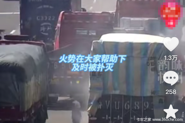 就在千钧一发之际,路过的卡友纷纷将车辆停下,好几位卡友飞身跑下驾驶室,拿着灭火器向着火的卡车奔去,在众人的力量下,险情被控制住。